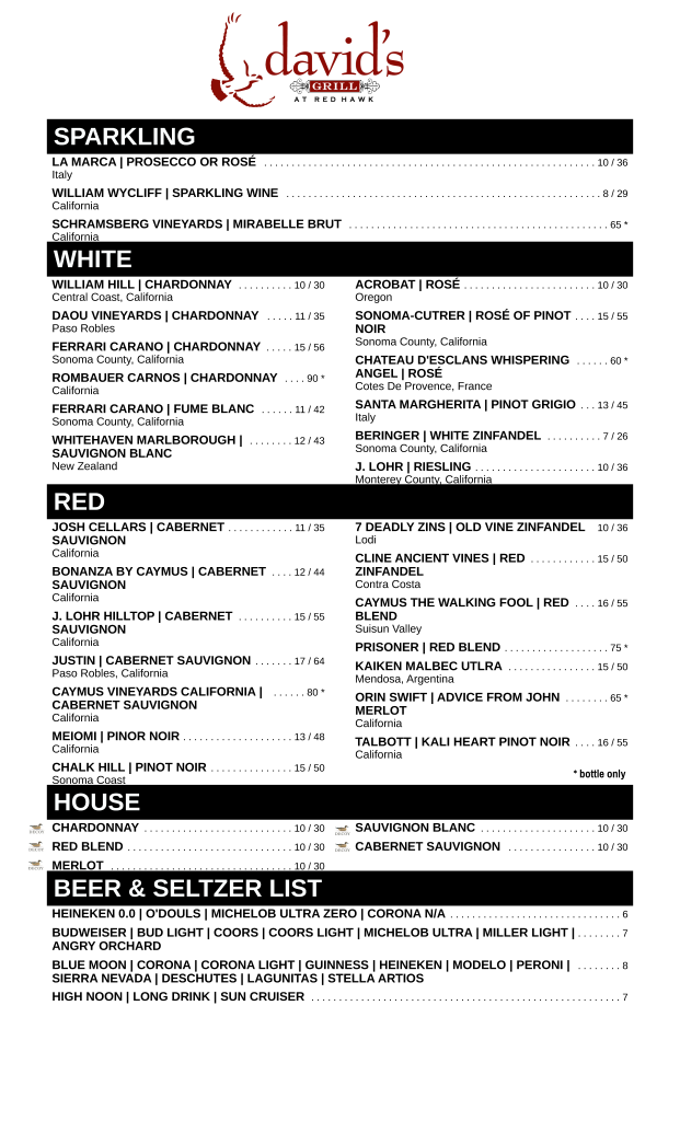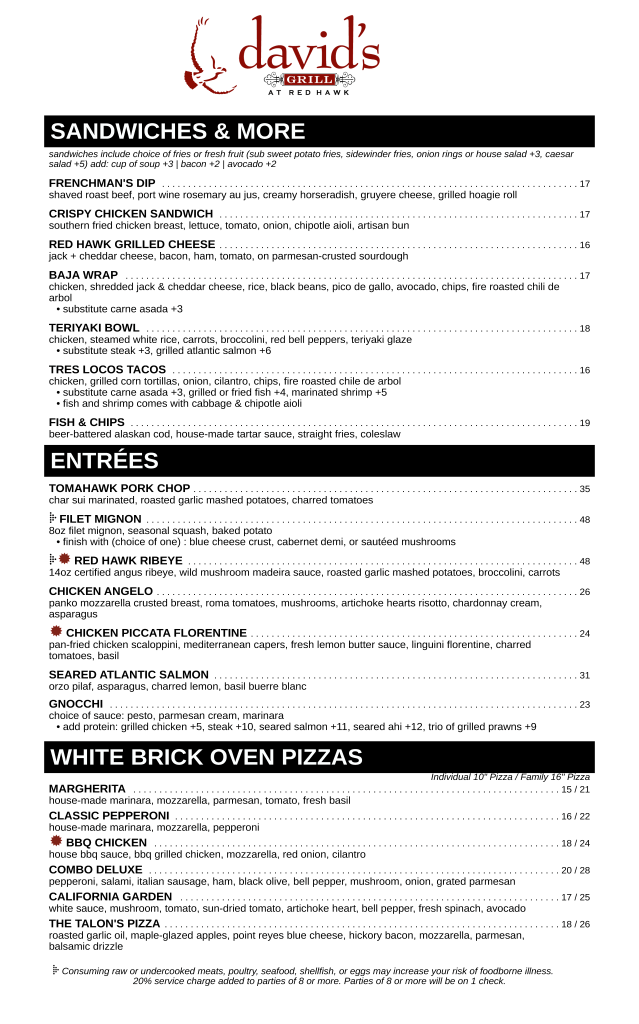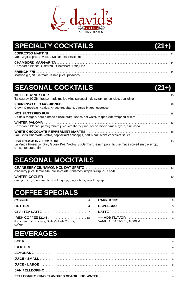David’s Grill Hours Breakfast: 8 AM – 11 AM Lunch: 11AM – 4 PM Dinner: 4 PM – 9 PM Late Night Bites: 8 PM – 9 PM Breakfast Menu Breakfast Menu Lunch Menu Lunch Menu Dinner Menu Dinner Menu Dessert Menu Dessert Menu Bar Bites Happy Hour Kid’s Menus